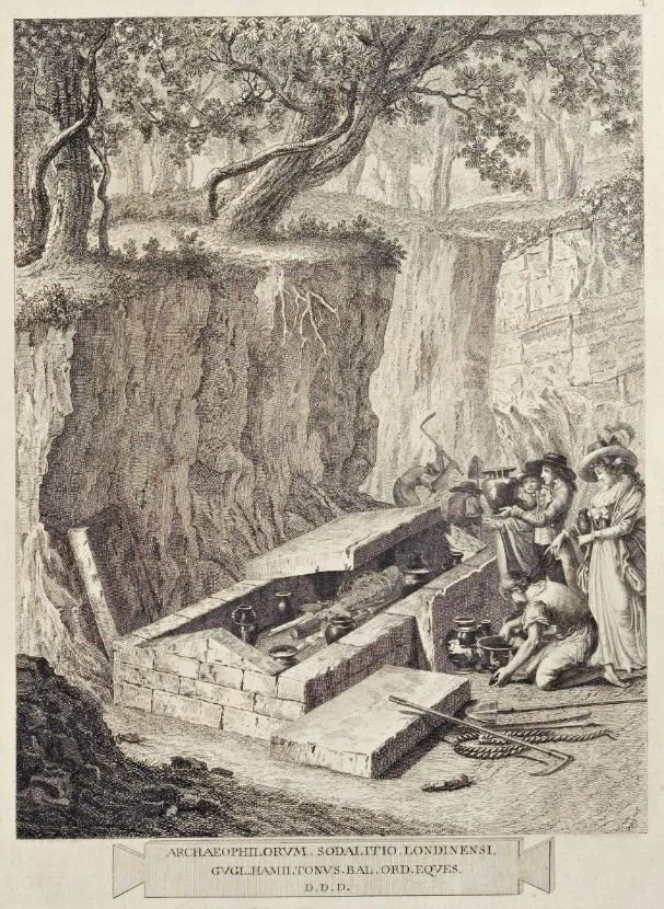 Illustration from Volume 1 of Sir William Hamilton’s second catalogue of vases (Collection of Engravings from Ancient Vases mostly of pure Greek workmanship discovered in Sepulchres in the Kingdom of Two Sicilies, 1791), showing a ‘sepulchre’ being opened probably in the Naples area. The woman on the right is almost certainly Lady Emma Hamilton, Admiral Nelson’s lover. Graves such as this in central Italy, often with valuable goods, were the source of most of the intact Greek vases that fill museums today - the western Greeks marketed them among the Etruscans to such an extent that antiquarians up to the time of Hamilton mistakenly thought of them as ‘Etruscan’ vases.