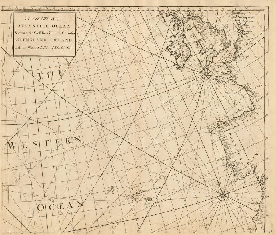 A chart (click to enlarge) of the ‘Western Ocean’ showing the final leg of the President’s voyage home, from the Western Isles ( Azores) to Cornwall (Atlas Maritime et Commercialis, London, 1728).