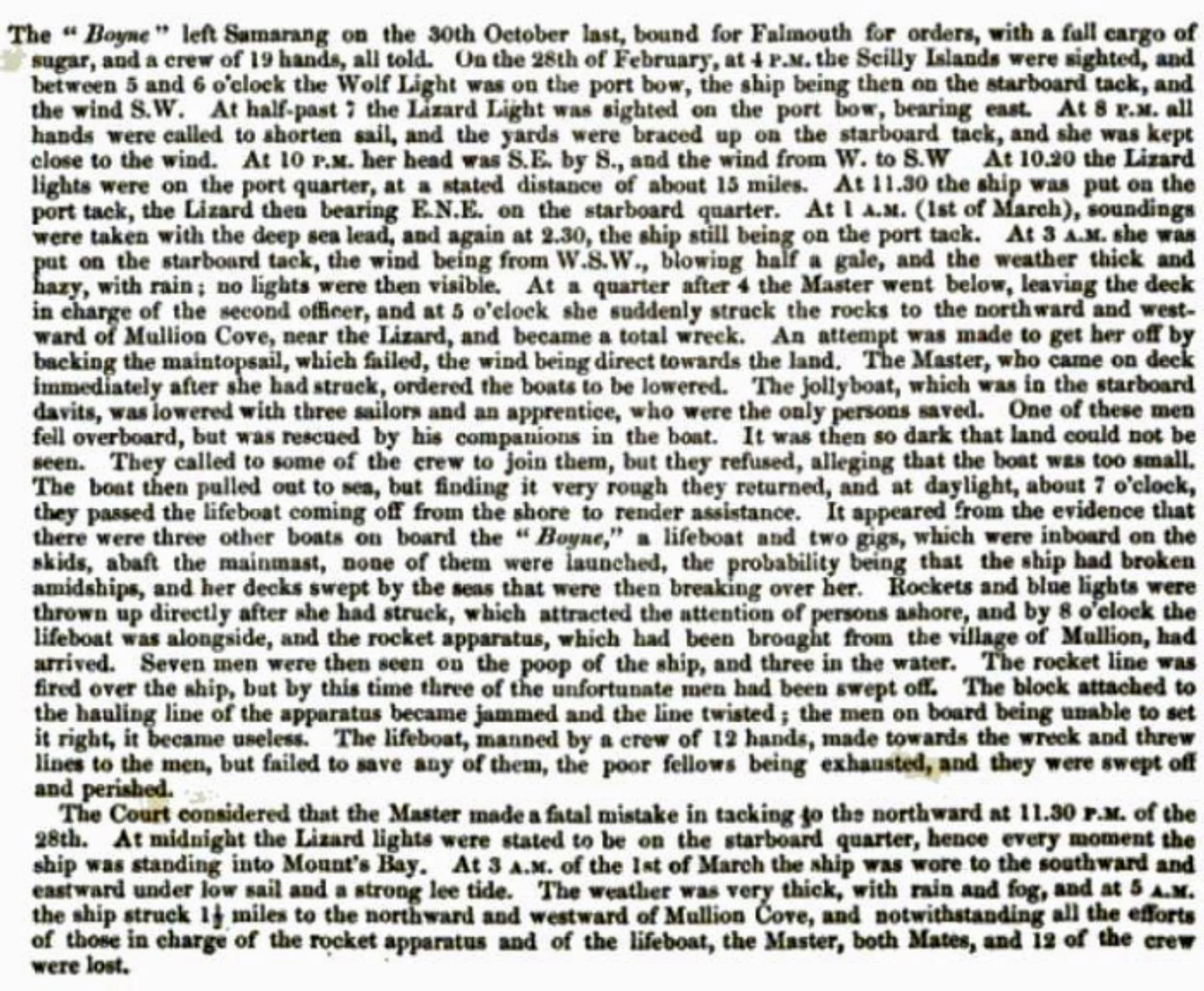 The full report of the Board of Inquiry held at Greenwich on the loss of the Boyne, ‘Stranded about one and a half miles N & W of Mullion Cove, near the Lizard, on the 1st of March 1873 (Accounts and Papers of the House of Commons, Vol. 61, 1874, p. 96).
