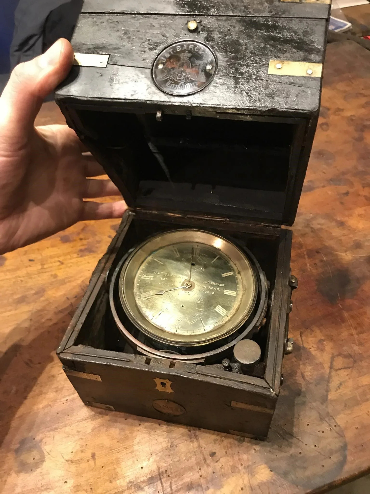 A nautical chronometer with its wooden box discovered by Ben Dunstan on the Boyne during our first dive together on the site in 2020 - one of the most remarkable finds ever made from a shipwreck off Cornwall. Click to enlarge and see below for more images.